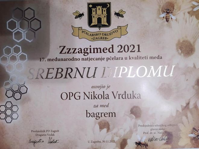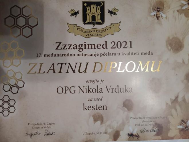 OPG Nikola Vrđuka tako je primio zlatnu diplomu za kestenov med i srebrnu diplomu za bagremov med.