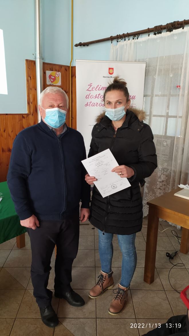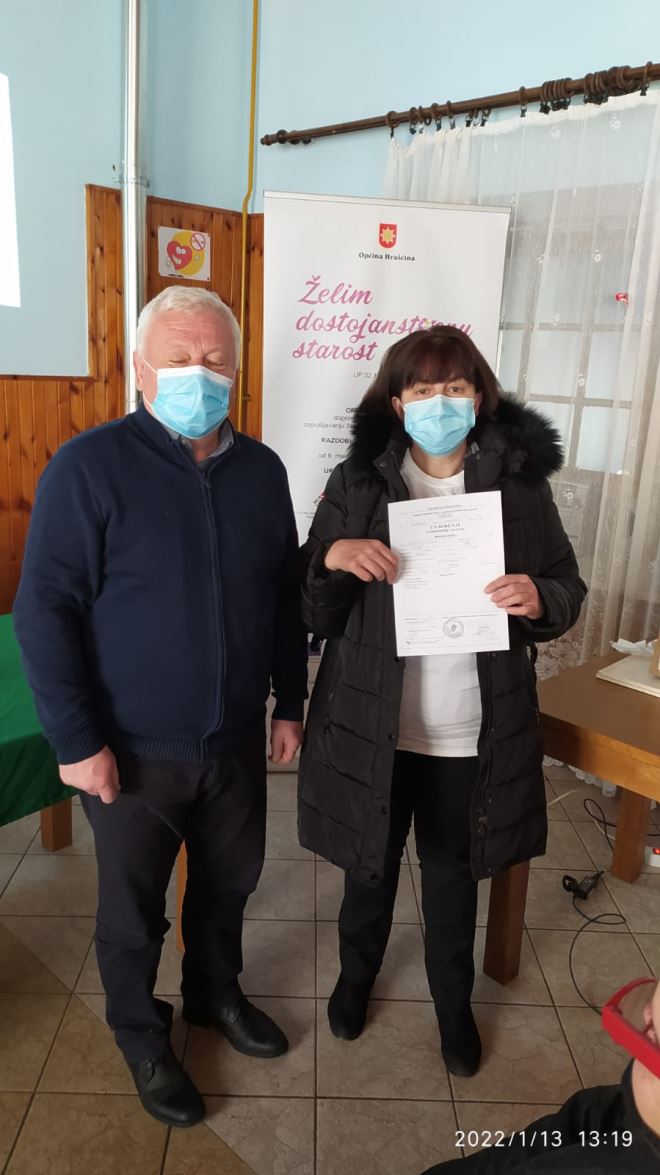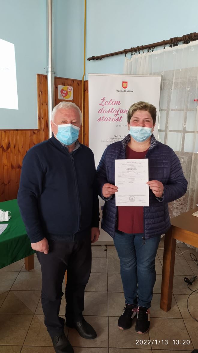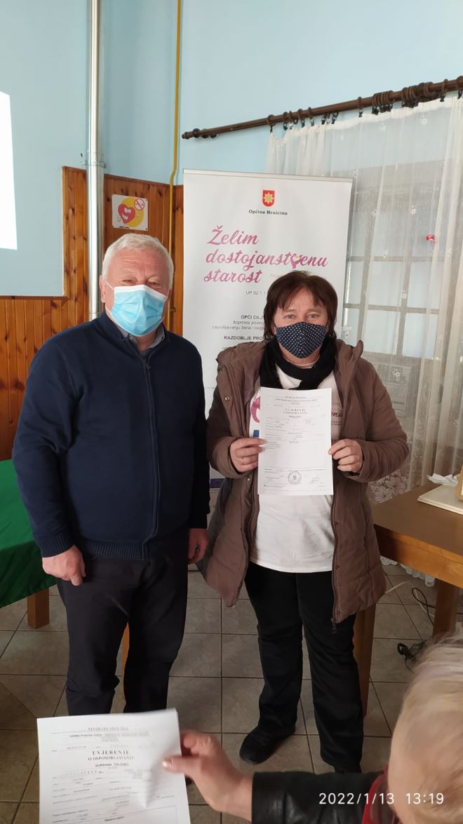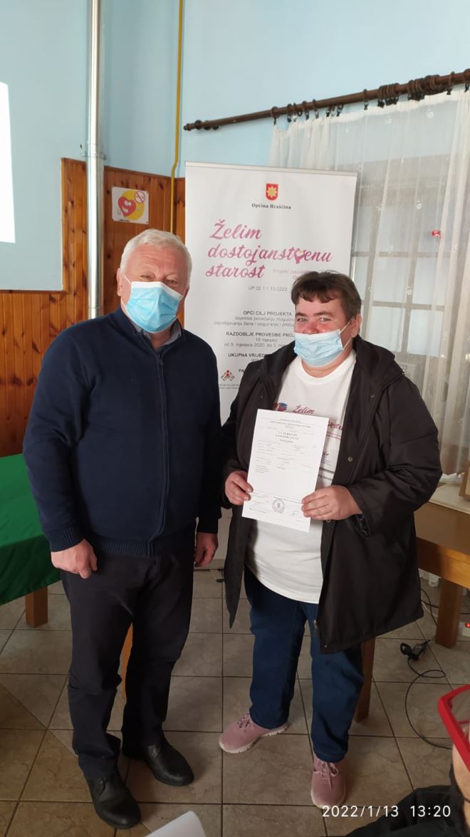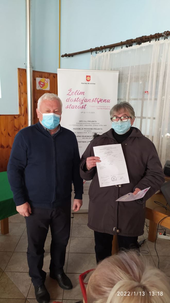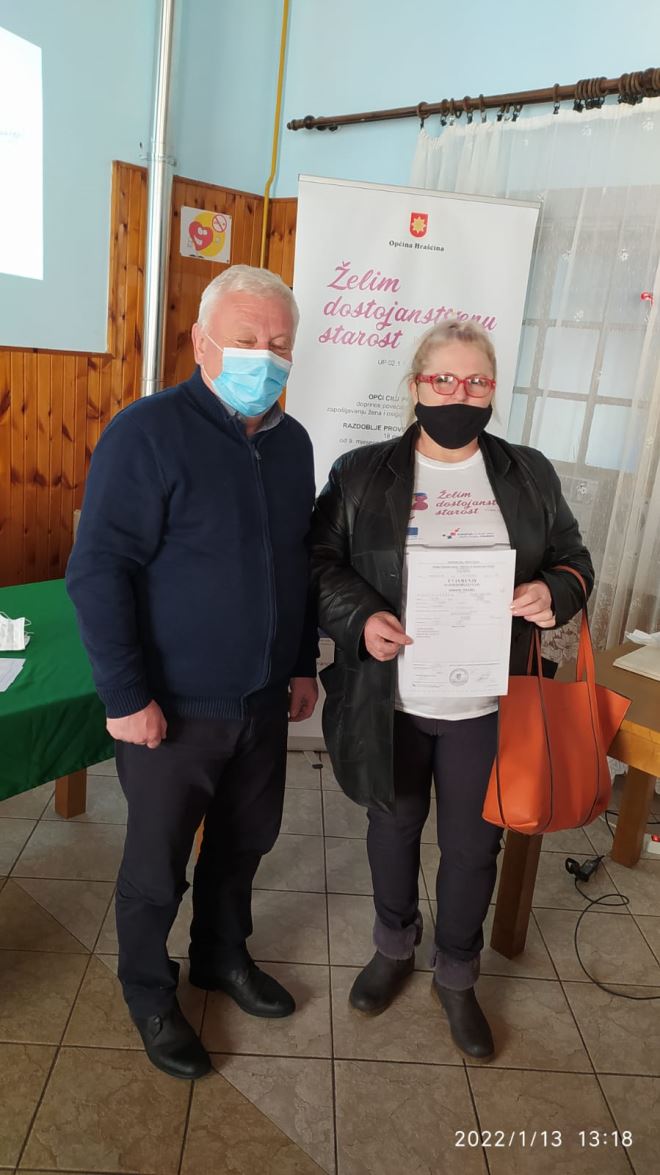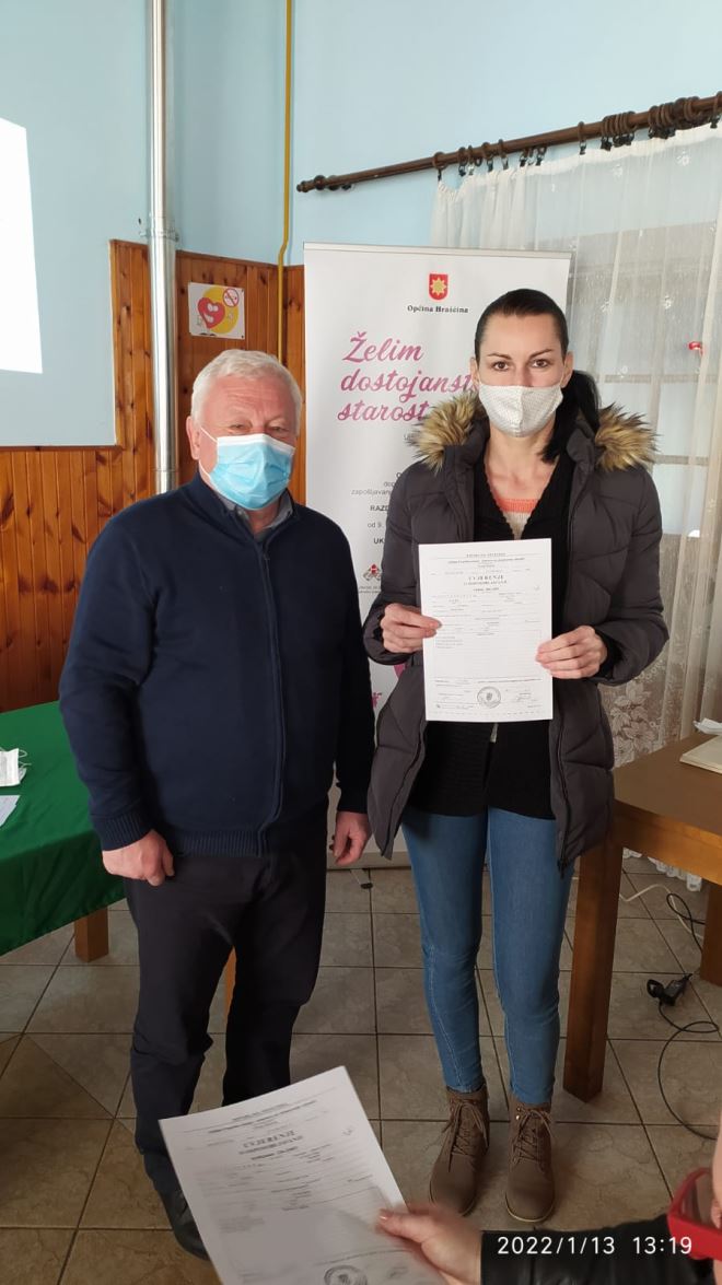 Završen je i projekt Želim dostojanstvenu starost' , financiran iz Europskog socijalnog fonda, Operativni program Učinkoviti ljudski potencijali 2014. – 2020., odnosno terenski rad gerontodomaćica s korisnicima, dok sam projekt traje do početka ožujka. Prošlog četvrtka održana je završna konferencija projekta na kojoj je načelnik Branko Tukač ženama zaposlenima na projektu uručio uvjerenja o položenom osposobljavanju za gerontodomaćice. O 65 korisnika brinulo je 10 gerontodomaćica, a trajao je od rujna 2020. godine. I gerontodomaćice i korisnici i više su nego zadovoljni, pa je načelnik Tukač vrlo zadovoljan provedenim projektom.
