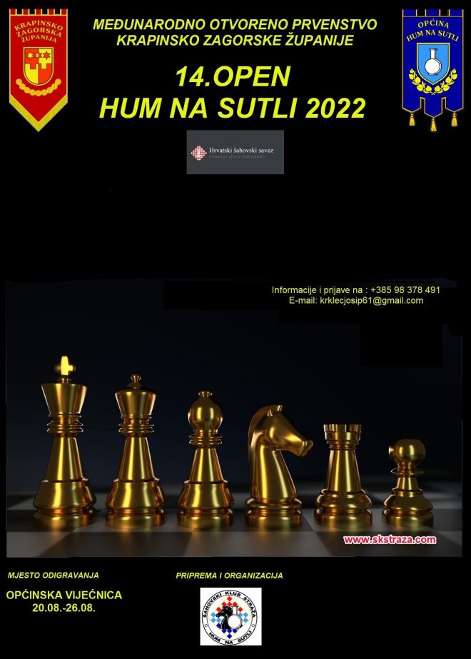 Šahovski klub Straža, Hum na Sutli organizira 14. open Hum na Sutli 2022. - Međunarodno otvoreno prvenstvo KZŽ. Turnir će se igrati od 20. do 26. kolovoza u Općinskoj vijećnici u Humu na Sutli. Predviđeno je odigravanje devet kola, sustav sparivanja – Švicarac. Direktor turnira je Josip Krklec, kod kojega se i primaju prijave na broj mobitela: 098 378 491 ili na mail: [email protected].