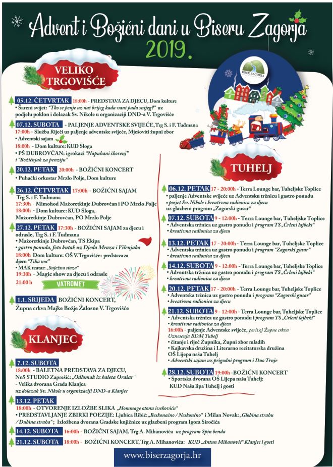 Turistička zajednica područja Biser Zagorja u koju su uključene općine Tuhelj, Veliko Trgovišće i Grad Klanjec, organiziraju i ove godine Advent i Božićne dane u Biseru Zagorja. U Velikom Trgovišću u četvrtak 5. prosinca u 18 sati održat će se predstava za djecu 'Tko se penje uz naš brijeg kada vani pada snijeg', uz podjelu poklona i dolazak sv. Nikole u organizaciji DND – a V. Trgovišće, u Domu kulture. Nastavlja se 7. prosinca paljenjem adventske svijeće i adventskim sajmom na središnjem Trgu u 17 sati, dok u 18 sati u Domu kulture nastupa KUD Sloga, a u PŠ Dubrovčan održat će se igrokazi 'Napuhani škorenj' i 'Božićnjak za penziju'. U petak 20. prosinca u 20 sati održat će se Božićni koncert Puhačkog orkestra Mrzlo Polje u Domu kulture, a 26. prosinca na Trgu S. I F. Tuđmana od 17 sati trajat će Božićni sajam, mimohod Mažoretkinja Dubrovčan i PO Mrzlo Polje. U 18 sati u Domu kulture mažoretkinje i puhači održat će nastup, kao i KUD Sloga. Božićni sajam za djecu i odrasle na trgu održat će se i 27. prosinca od 17.30 sati, uz Mažoretkinje Dubrovčan, TS Ekipa, gastro ponudu, foto kutak uz Djeda Mraza i vilenjaka. U Domu kulture bit će u 18 sati predstava za djecu 'Tiha nož', MAK Teatar izvest će 'Snježnu stazu', a u 21 sat počinje vatromet. Na Novu godinu, 1. siječnja, održat će se i Božićni koncert u Župnoj crkvi Majke Božje Žalosne.