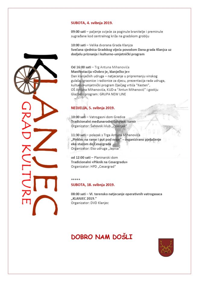 Zanimljivo će biti i na manifestaciji “Dobro je, klanječko je” koja će se održati 4. svibnja od 16 sati na Trgu Antuna Mihanovića, a uz kuharske ekipe naših udruga koje će se natjecati u pripremanju vinskog gulaša, ove im se godine pridružuju i gradski vijećnici te načelnici susjednih općina. Glazbeno-plesni program pripremaju dječji vrtić, škola, KUD s gostima, a svira grupa New Line. Nadamo se zato lijepom vremenu tijekom cijeloga tjedna, a osobito u nedjelju, 5. svibnja kad ćemo svi put Cesargrada na tradicionalni piknik HPD-a “Cesargrad”.
