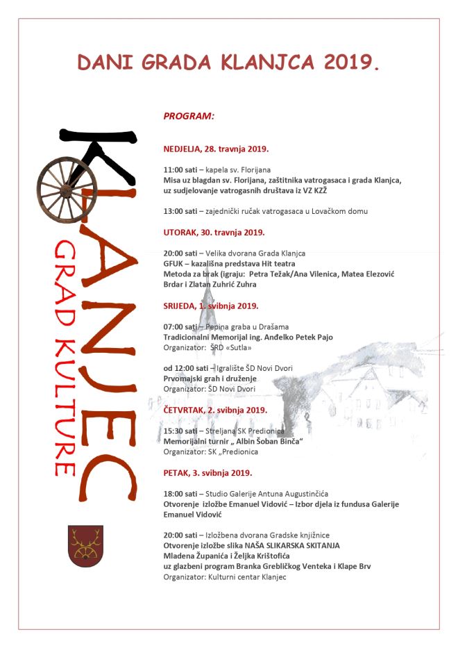 Grad Klanjec ovih dana proslavlja blagdan sv. Florijana, svog zaštitnika, kao i Dan grada. Klanječke kulturne ustanove i udruge pripremile su raznovrstan program u danima od 28. travnja pa sve do 5. svibnja. Klanječki vjernici i vatrogasci iz Krapinsko-zagorske županije tradicionalno će se okupiti na misi ispred kapele sv. Florijana u nedjelju, 28. travnja u 11 sati, a svečana sjednica Gradskog vijeća održat će se u subotu, 4. svibnja u Velikoj dvorani Grada Klanjca kada će u nazočnosti brojnih uzvanika i gostiju biti uručena i ovogodišnja gradska priznanja.