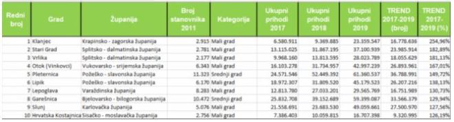 Vodećih deset gradova po visini proračunskih prihoda po stanovniku, ukupnim i prosječnih, u razdoblju od 2017. do 2019. godine nalaze se uz obalu. U trendu rasta prihoda prevladavaju, pak, gradovi na kontinentu. U postocima, najviše je proračunske prihode povećao Grad Klanjec i to za 254,96 posto.