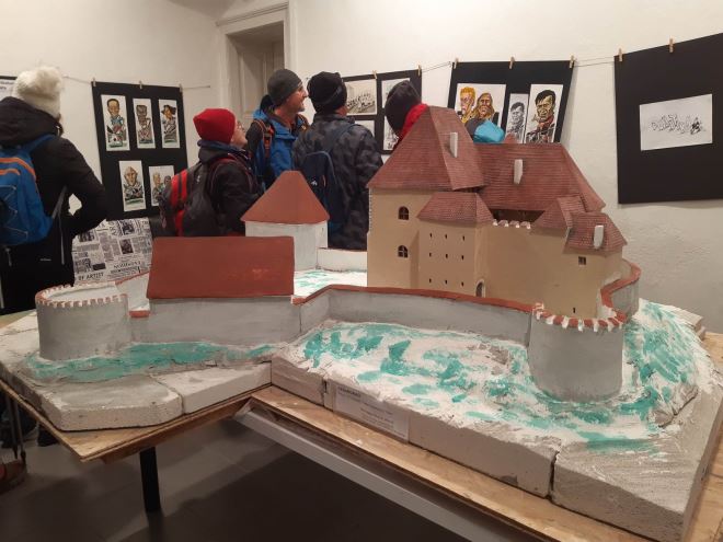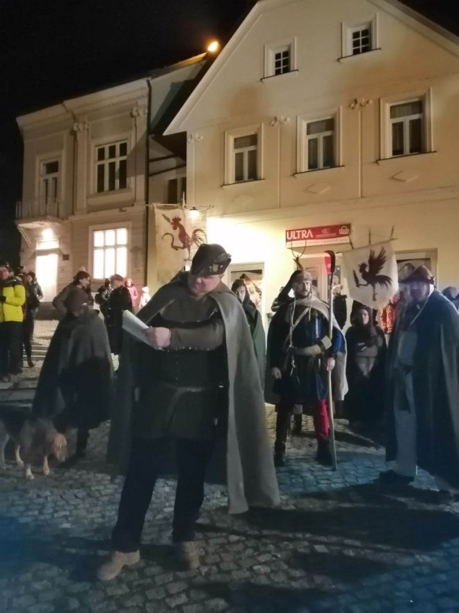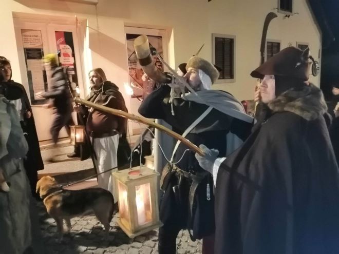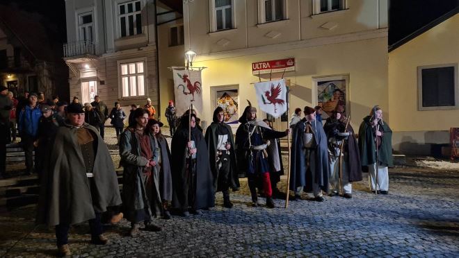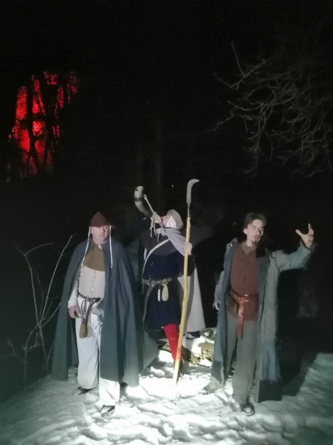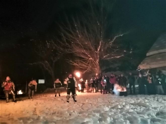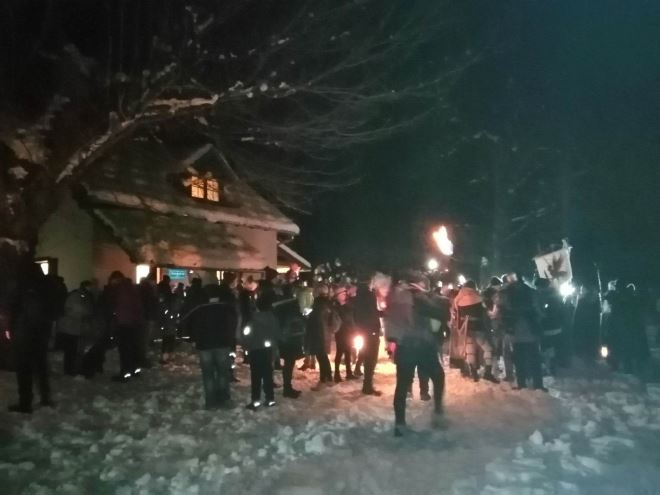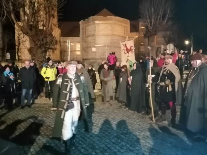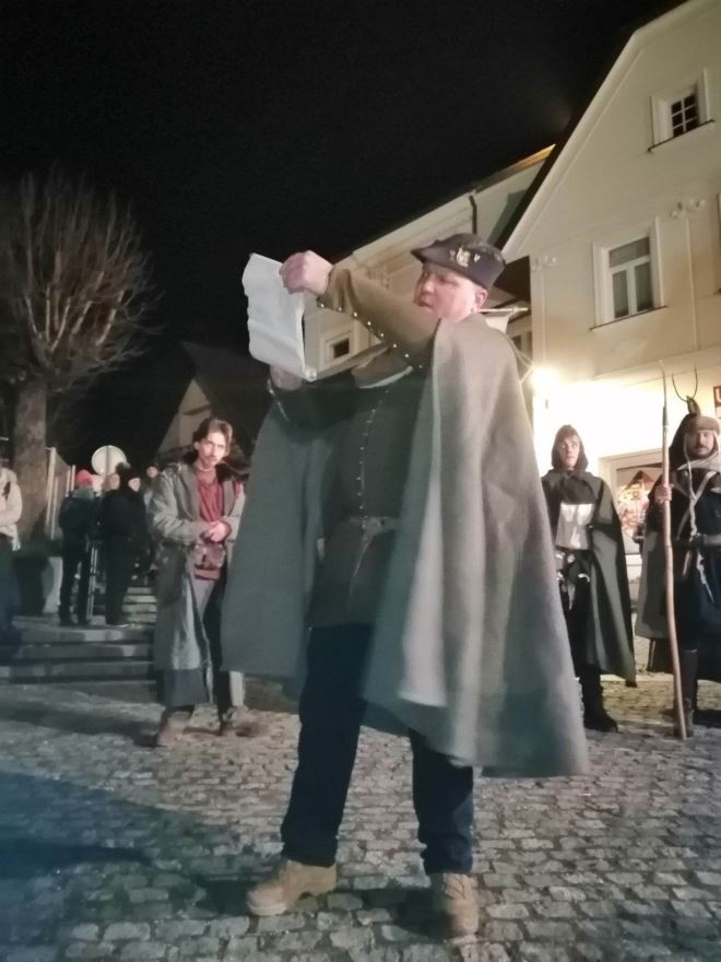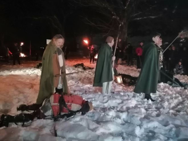 Ispred planinarske kuće uslijedio je scenski prikaz sukoba kmetova i Cesargradske straže uz svjetlosnu instalaciju na zidinama utvrde, u izvedbi Družbe vitezova Zlatnog kaleža iz Donje Stubice. Okupljeno mnoštvo doista je uživalo u uvjerljivom uprizorenju bitke u prekrasnom snježnom ambijentu Cesargrada s osvjetljenim zidinama u daljini.