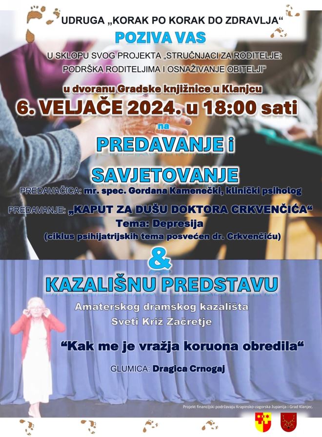 Udruga “Korak po korak do zdravlja” nastavlja i u ovoj godini s aktivnostima u okviru projekta “Stručnjaci za roditelje: podrška roditeljima i osnaživanje obitelji”, ali tema je ovaj put svakako zanimljiva i sigurni smo da će predavanje i savjetovanje kliničke psihologinje Gordane Kamenečki biti korisno za sve naše građane. U utorak 6. veljače 2024. s početkom u 18:00 sati u dvorani Gradske knjižnice u Klanjcu govorit će se o depresiji i to u sklopu ciklusa predavanja psihijatrijskih tema “Kaput za dušu doktora Crkvenčića” koja se organiziraju u čast poznatog zagorskog psihijatra.