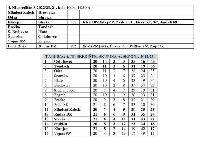 U derbiju začelja IV. NL središte Zagreb skupina A u 21. kolu snage su odmjerili Klanjec i Straža. Gosti su bili puno bolji protivnik, osobito u nastavku i na kraju su zasluženo slavili s 5:1 u režiji bivšeg slovenskog reprezentativca i velemajstora nogometa Ivana Firera. Iako je u 38. godini ovaj nogometaš još zadivljuje svojem potezima i užitak ga je gledati.