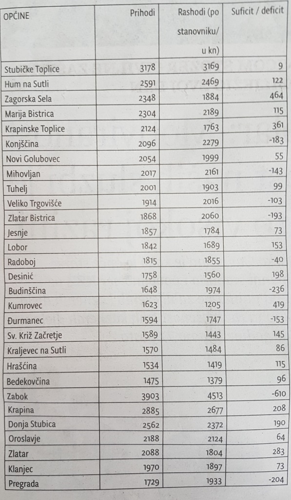 Najveći prihod po stanovniku, izražen u kunama, imaju Stubičke Toplice. Taj prihod iznosi 3178 kuna. No u isto vrijeme, vrlo su visoki i rashodi koji iznose 3169 kuna. Ipak, svi navedeni podaci Stubake svrstavaju među one općine koje bilježe suficit, i to u iznosu od 9 kuna. Na drugom mjestu po veličini prihoda je Hum na Sutli. Tamo prihodi po stanovniku iznose 2591 kunu, a rashodi 2469. I Hum na Sutli bilježi suficit kada se sagledaju obje brojke. Taj suficit iznosi 122 kune. Na trećem su mjestu po visini ostvarenih prihoda po stanovniku Zagorska Sela. Prihod po stanovniku tamo je 2348 kuna. Rashod je tamo pak znatno manji - 1884 kune, čime dolazimo do brojke da ta mala općina ima najveći suficit među svim općinama, koji iznosi 464 kune. Najmanje prihode po stanovniku bilježi Bedekovčina – 1475 kuna, no od tog su iznosa manji rashodi koji su 1379 kuna. Suficit iznosi 96 kuna. Na predzadnjem je mjestu Hrašćina koja ima prihode od 1534 kune po stanovniku, a rashode 1419 kuna što nas dovodi do suficita od 115 kuna. Na tablicu prije Hrašćine smjestio se Kraljevec na Sutli koji bilježi prihode od 1570 kuna po stanovniku i rashode 1484 kuna te suficit od 86 kuna. Kao što smo već spomenuli, među općinama, najveću pozitivnu razliku između rashoda i prihoda (suficit) po stanovniku imaju Zagorska Sela dok najveću negativnu razliku između prihoda i rashoda (deficit) ima Budinščina.