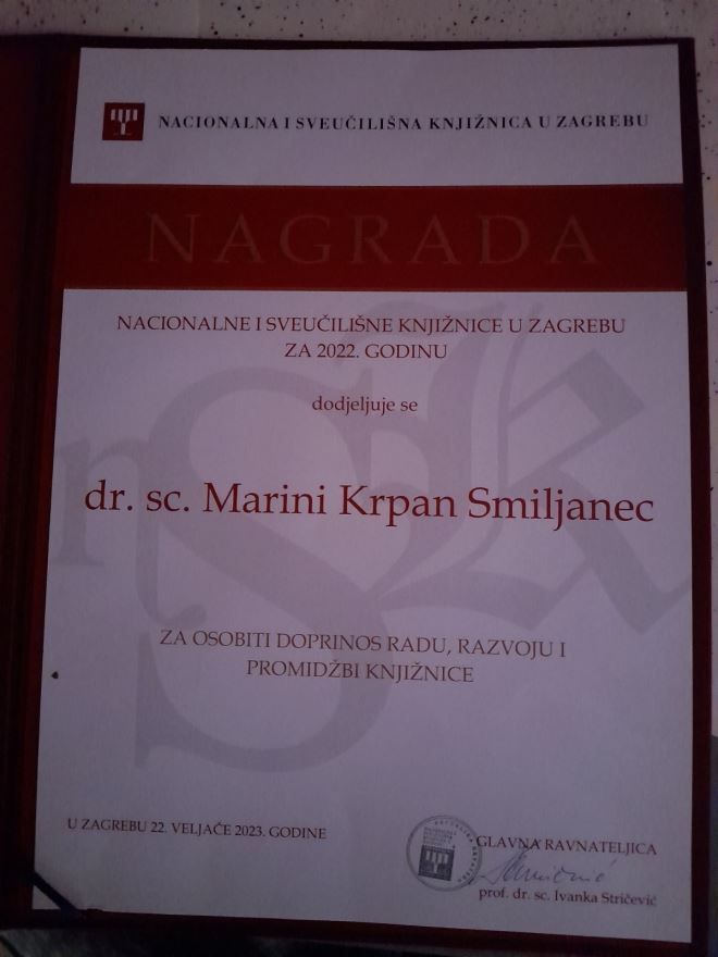 Od nagradi Nacionalne sveučilišne knjižnice koje su dodijeljene u prisutnosti predsjednika Republike, jednu, i to najznačajniju, dobila je dr. sc. Marina Krpan Smiljanec iz Klanjca
