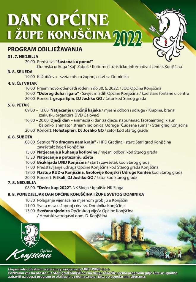 U četvrtak 4. kolovoza u 10 sati održat će se na Općini prijem novorođenčadi rođene u prvoj poovici godine, ‘Dobrog duha i igara’ program je kojeg priprema Savjet mladih Općine Konjščina kod stare fontane u centru u 16 sati, a u 20 sati na redu je koncert Grupe Spin i DJ Joshko GO u šatoru kod Starog grada.