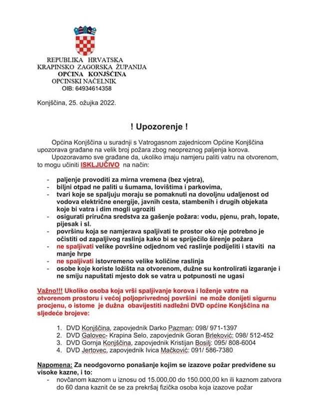 Na svom Facebook profilu su napisali kako je na intervenciju izašlo 12 vatrogasaca dvama navalnim vozilima. ''Pravovremenom dojavom mještana i našim brzim izlaskom spriječeno je širenje požara u šumu''. – napisali su vatrogasci DVD Konjščina, i još jednom upozorili mještane.