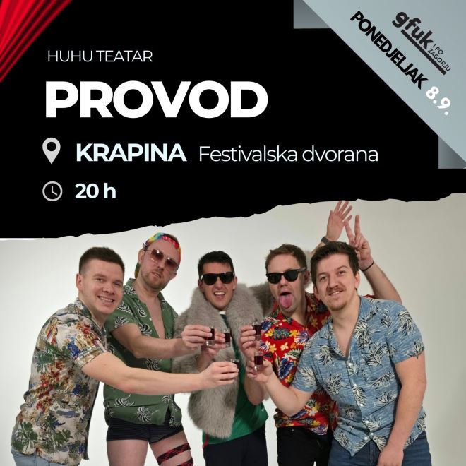 U sklopu 60. Tjedna kajkavske kulture, u ponedjeljak 8. rujan od 20 sati gledamo novu hit komediju 'Provod' HuHu teatra iz Zagreba, a u rganizaciji Glumačkog festivala u Krapini,