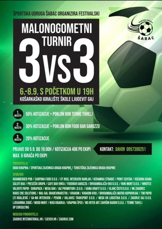Na vanjskom igralištu OŠ Augusta Cesarca 6. rujna održat će se finale škola u futsalu i rukometu za 6. 7. i 8. razrede, a od 6. do 8. rujna u organizaciji Sportske udruge Šabac održat će malonogometni turnir 3 VS 3 na košarkaškom igralištu kod OŠ Ljudevit Gaj.