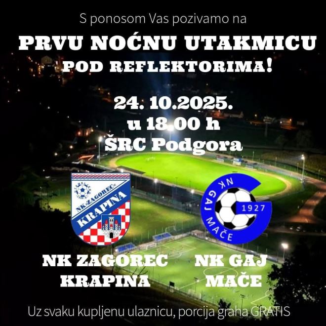 - Krapina s ponosom stoji uz svoj Zagorec, klub koji više od stoljeća predstavlja sportski ponos našeg grada. Reflektori na Podgori simbol su nove energije i ulaganja u sportsku infrastrukturu, ali i dokaz da Krapina živi nogomet. Vjerujem da će prva noćna utakmica biti pravi spektakl i pozivam sve sugrađane da dođu bodriti naše dečke – poručio je Gregurović.