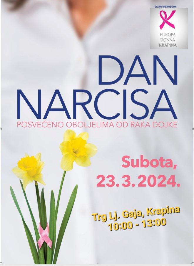 Europa Donna Krapina obilježit će nacionalni Dan narcisa i ove godine u Krapini na središnjem trgu. Predstavit će zajedno sa Javnim zdravstvom Krapinsko-zagorske županije podatke o Nacionalnom programu provođenja preventivnih pregleda, kupljenom prvom vakumskom uređaju u Republici Hrvatskoj u čijoj nabavci je sudjelovala i Udruga Europa Donna Krapina te će predstaviti novu ambasadoricu udruge poznatu zagorsku pjevačicu Barbaru Suhodolčan.