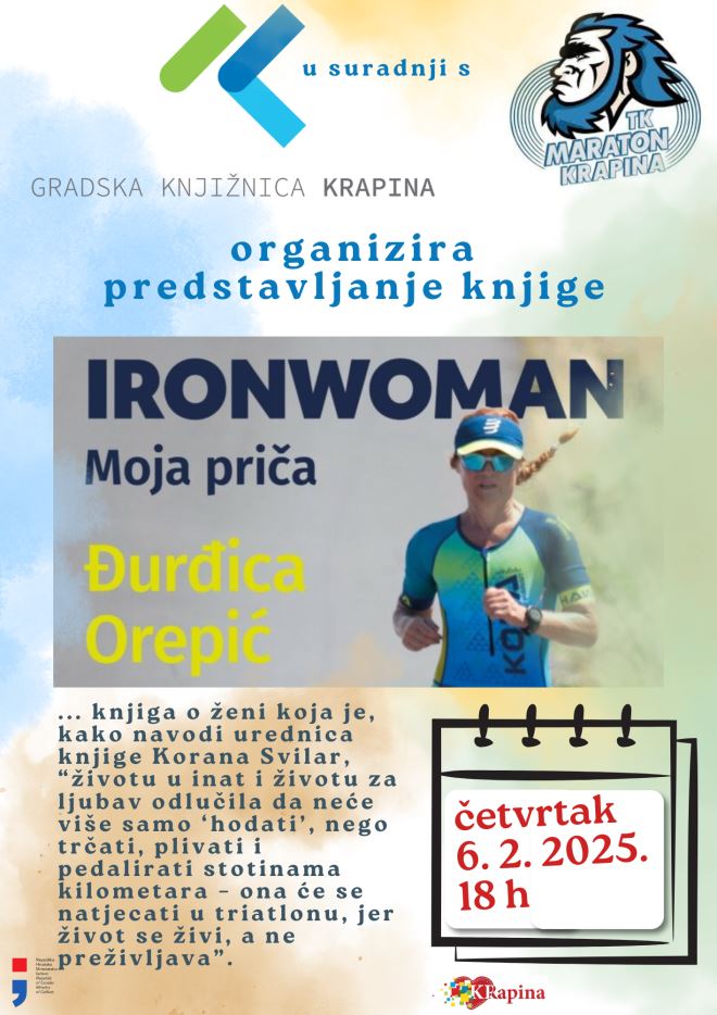 Gradska knjižnica Krapina u suradnji s TK Maraton Krapina organizira predstavljanje knjige pod nazivom “Ironwoman: moja priča!” autorice Đurđice Orepić. Predstavljanje će se održati u četvrtak, 6. veljače 2025. s početkom u 18.00 sati u Plavoj dvorani.