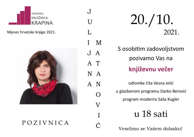 Povodom Mjeseca hrvatske knjige 2021. u Gradskoj knjižnici Krapina održat će se književna večer s Julijanom Matanović. U srijedu 20. listopada svi su pozvani na ovo zanimljivo druženje koje počinje u 18 sati. Odlomke će čitati Vesna Jelić, a u glazbenom program sudjelovat će Darko Berović. Moderator će biti Saša Kugler.
