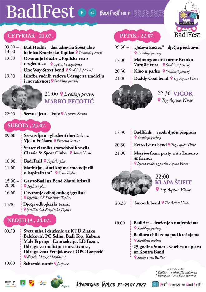 - Kroz ova četiri dana pripremili smo razne programe te ih tematski podijelili na BadlFun, BadlKids, BadlSport, BadlArt, BadlHealth, BadlGastro, BadlTradicija i BadlKultura. Tako da će uistinu svi naši gosti i posjetitelji, bez obzira na dob i osobni ukus te preferencije, moći na ovogodišnjem BadlFestu pronaći nešto za sebe. Što se tiče zabavnog dijela programa, nazvanog BadlFun, za ovu smo godinu pripremili koncerte tenora Marka Pecotića, grupe Vigor, Klape Šufit, bandova Daddy Cool, One Way Street, Trnje, Retro Guru, Smooth, a očekuje nas i nastup Vjeke Fučkara, Zlatnih kristala i Kontra Banda. Isto tako, ove godine zabavi se pridružuje i Vodeni centar Aquae Vivae, gdje će se održati pjena party uz DJ-a Lorenza. Sve programe vrijedno će pratiti ugostitelji s bogatom ponudom hrane i pića – rekla je načelnica Općine Krapinske Toplice, ujedno nova predsjednica TZ Srce Zagorja Gordana Jureković.