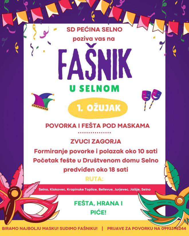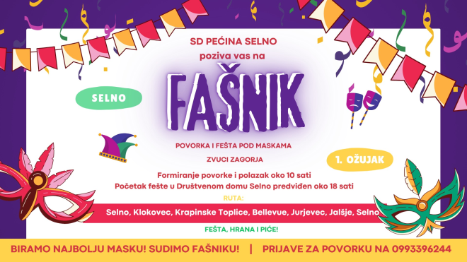 Sportska udruga "Pećina" Selno organizira fašnik u subotu 1. ožujka.