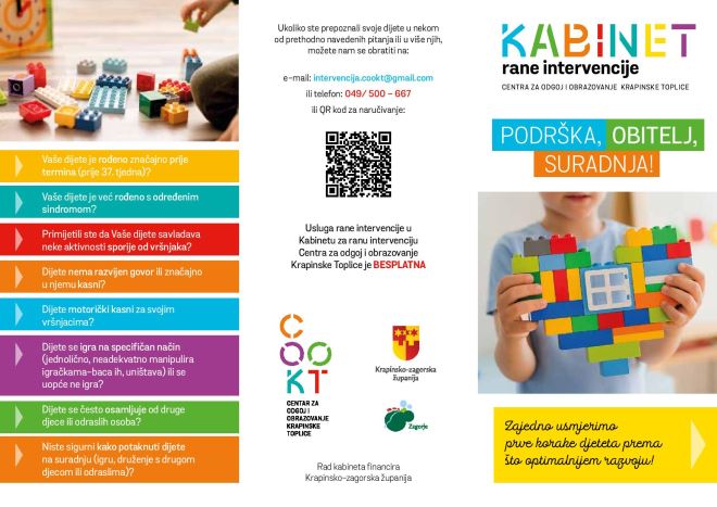 Otvaranje kabineta za ranu intervenciju ujedno je i jedna od aktivnosti u projektu „Krapinsko-zagorska županija-prijateljica djece“. U županiji se kontinuirano razvija mreža usluga za djecu, na temelju čega je Krapinsko-zagorska županija i stekla titulu Županija-prijatelj djece 2018. godine, kao prva, uz Primorsko-goransku županiju, u Republici Hrvatskoj. Između ostalog, Krapinsko-zagorska županija uložila je snažne napore da se osnaže općine i gradovi u osiguranju dostupnosti logopedske službe. Razvijen je model prema kojem su se uspostavili logopedski kabineti za područje Županije na način da jedan logopedski kabinet djeluje na području dvije ili više jedinica lokalne samouprave koje zajednički sufinanciraju njegov rad. Krapinsko-zagorska županija uključila se u nabavku opreme za logopedske kabinete na području Grada Klanjca i Općina Kumrovec, Desinić, Zlatar Bistrica i Bedekovčina, te podupirala projekte organizacija civilnog društva kojima je bio cilj otvaranje i rad logopedskog kabineta. Do sada je u tu svrhu izdvojila ukupno 100.000,00 kn. Rana intervencija u segmentu neurorazvojne dijagnostike i terapije već se niz godina provodi u Specijalnoj bolnici za medicinsku rehabilitaciju Krapinske Toplice. Ono što nedostaje je integrativnost u postupanju, a sve strukture i sustav moraju stvoriti podlogu za integrirani pristup. U cilju unapređenja i proširenja usluga rane intervencije za djecu s neurorizicima i razvojnim poteškoćama Krapinsko-zagorska županija usmjerila se na stvaranje uvjeta da većina djece mogu i druge dijagnostičke pretrage i rehabilitacijske postupke obaviti u ustanovama na području KZŽ te pružanje podrške roditeljima i drugim stručnjacima koji rade s djecom. U posljednjih pet godina osigurana su sredstva za edukaciju stručnjaka, uređenje i opremanje prostora za pružanje usluga rane intervencije te dodatno zapošljavanje stručnjaka. Tako je financirana dodatna edukaciju iz rane intervencije za četiri stručnjaka iz COO Krapinske Toplice koji će stečene znanja primjenjivati u svom radu u Kabinetu za ranu intervenciju. Za troškove uređenja i opremanja prostora za ranu intervenciju pri Specijalnoj bolnici za medicinsku rehabilitaciju Krapinske Toplice i COO Krapinske Toplice izdvojeno je preko 200.000 kn. Od 2016. godine izdvaja se oko 150.000 kn godišnje za troškove dodatnog stručnog djelatnika u predškolskoj skupini Centra za odgoj i obrazovanje Krapinske Toplice, a kao rezultat više nema liste čekanja. Prošle godine izdvojeno je 110.000 kn za sanaciju i opremanje prostora namijenjenog za pružanje usluge rane intervencije te edukaciju stručnjaka u COOKT, a ukupno je od 2016. godine za troškove djelatnika u predškolskoj skupini i opremanje prostora Centra za odgoj i obrazovanje Krapinske Toplice i Specijalne bolnice za medicinsku rehabilitaciju Krapinske Toplice te logopedske kabinete izdvojeno nešto više od milijun kuna.