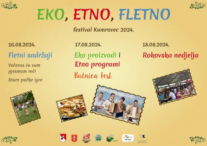 Sa 16. kolovozom kreće sedmo izdanje kumrovečke manifestacije Eko, etno, fletno koje će trajati do 18. kolovoza. Dakle, ovogodišnji program podijeljen je na tri tematska dana, a organizaciju potpisuju Općina Kumrovec, DND Kumrovec, Turistička zajednica Kumrovec, Desinić, Zagorska Sela i DVD Kumrovec.