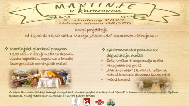 U podne kreće Martinjski glazbeni program i krštenje mošta po drevnim vinsko-pajdaškim regulama u izvedbi cesargradskih martinjskih meštra u Muzeju “Staro selo” Kumrovec. Neće nedostajati gastronomske ponude uz degustaciju mošta, a na stolu će se naći čaša, vrećica + degustacija mošta, vinogradarski gulaš, ‘Martinov obed’ (krvavica, pečenica, restani krumpir, dinstano kiselo zelje), pečeni kesteni.