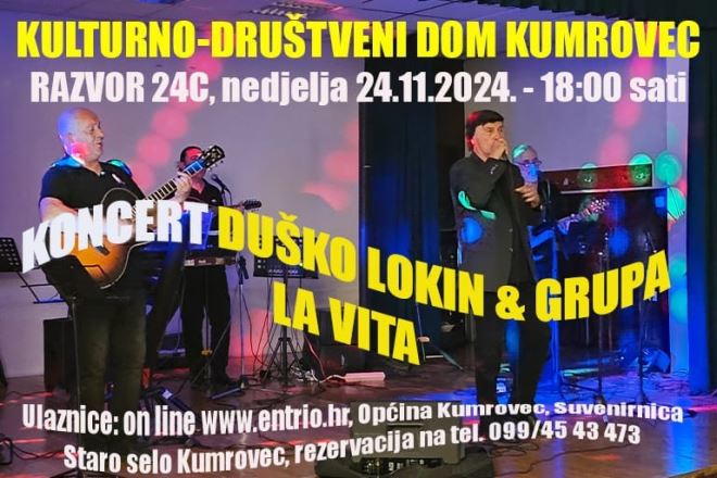 U Kulturno-društveni dom u Kumrovcu na adresi Razvor 24C, u nedjelju 24. studenog u 18 sati održat će se koncert Duška Lokinja i grupe La vita.