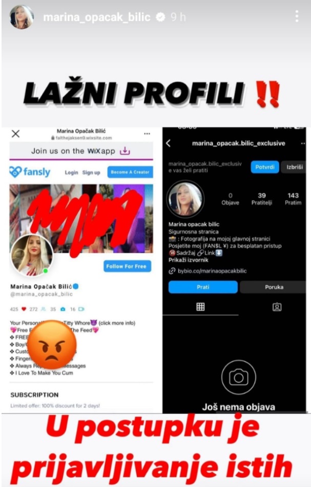 Saborska zastupnica Marina Opačak Bilić danas je saznala da joj je netko na Instagramu i na pornografskoj stranici napravio lažne profile. "Lažni profili! U postupku je prijavljivanje istih", napisala je u storyju na Instagramu.