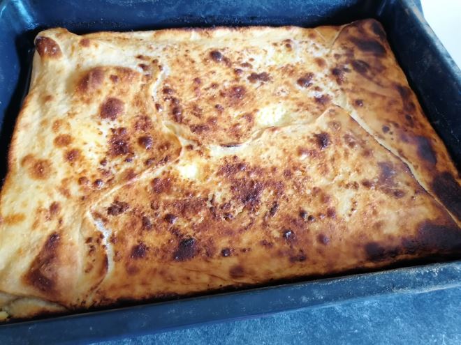 Tijesto razvaljati i razvući na veličinu veću od protvana (tako da kad ga stavite u protvan visi sa svih strana van). Protvan namastiti s mašću, staviti tijesto, posipati da s tri prstohvata brašna. Na to staviti nadjev i ravnomjerno rasporediti, ponovo posipati s tri prstohvata brašna. Tijesto preklopiti preko nadjeva.