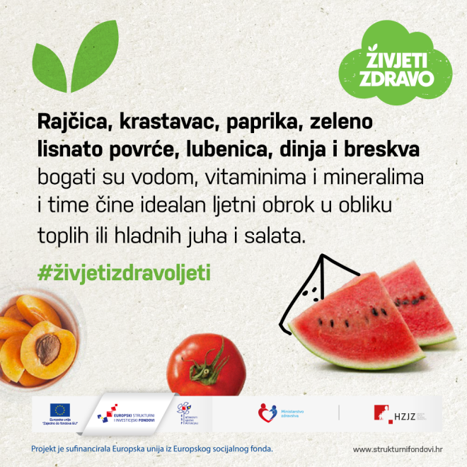 Ljetne vrućine imaju snažan utjecaj na stanje našeg organizma. Visoke temperature zraka uzrokuju pojačano znojenje, a time i povećan gubitak tjelesne tekućine i elektrolita. Rajčica, krastavac, paprika, zeleno lisnato povrće, lubenica, dinja i breskva koji su bogati vodom, vitaminima i mineralima čine idealan ljetni obrok. Vrijeme je da uživamo u laganim, osvježavajućim i raznobojnim obrocima koji se brzo pripremaju. Umjesto slane, masne i teške hrane na stolu neka se nađu šarene salate, tople i hladne juhe, svježi voćni i povrtni sokovi.