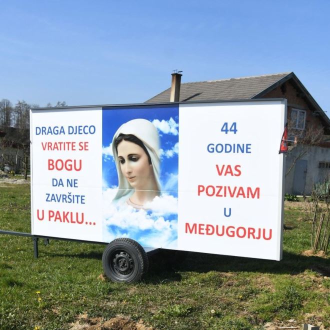 U sredini je slike Gospe, a s desne strane piše "44 godine vas pozivam u Međugorju", aludirajući na navodna ukazanja koja su se dogodila prije 44 godine.