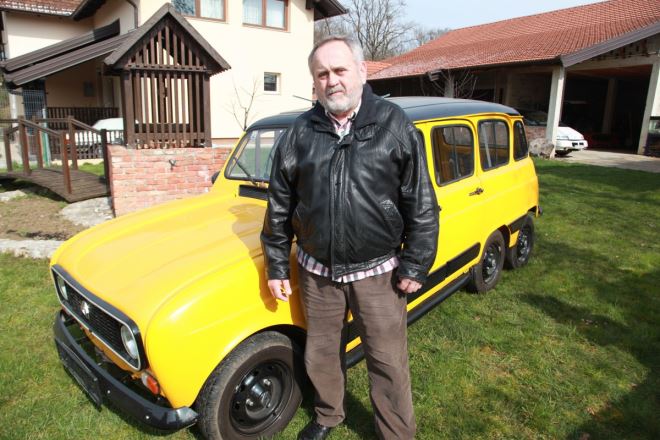 Jeste li kad vidjeli Renault 4 na 6 kotača? Ako jeste, onda je to bio žuti 'renolček' Jurice Bizjaka iz Zlatara, inače vlasnika i poznatog žutog Hammera. - To je jedini Renault 4 na 6 kotača u svijetu – pojašnjava ponosno vlasnik. Sređivao ga je oko dvije godine. - Najprije smo ga s kumčetom postavili u osnovne linije, produžili ga za još jednu osovinu, a onda odveli u limarsku radionicu gdje je dotjeran. Star je 26 godina, on ne može biti oldtimer. Može po godinama, ali čim se izmijeni šraf na originalu on se više ne može certificirati - pojasnio je Bizjak.