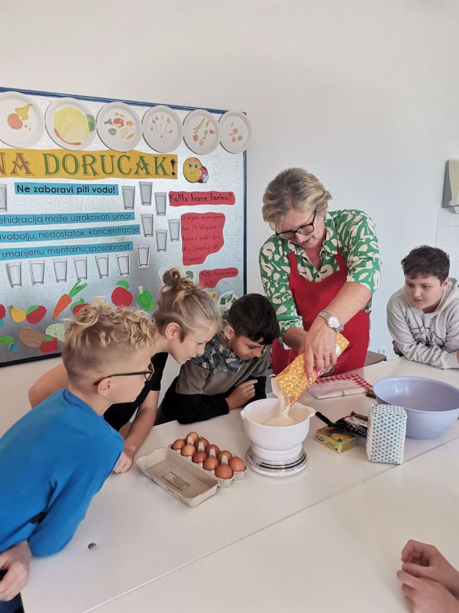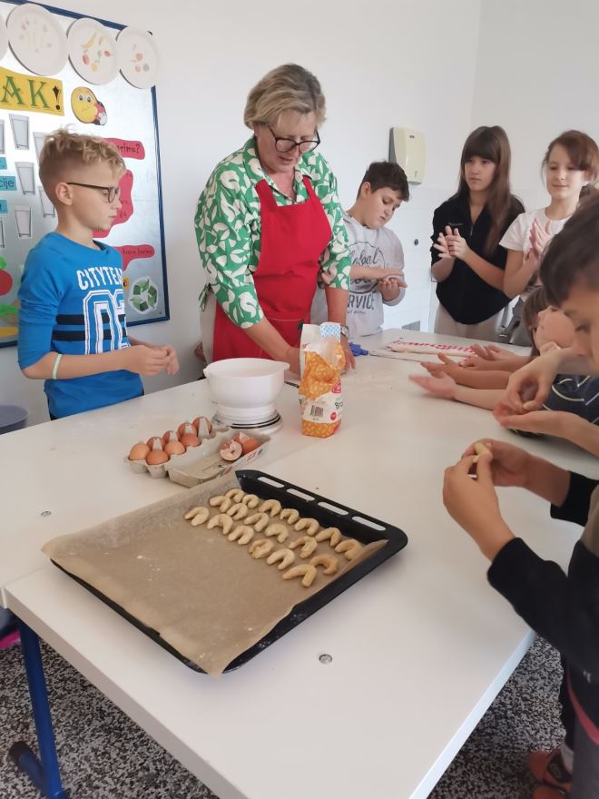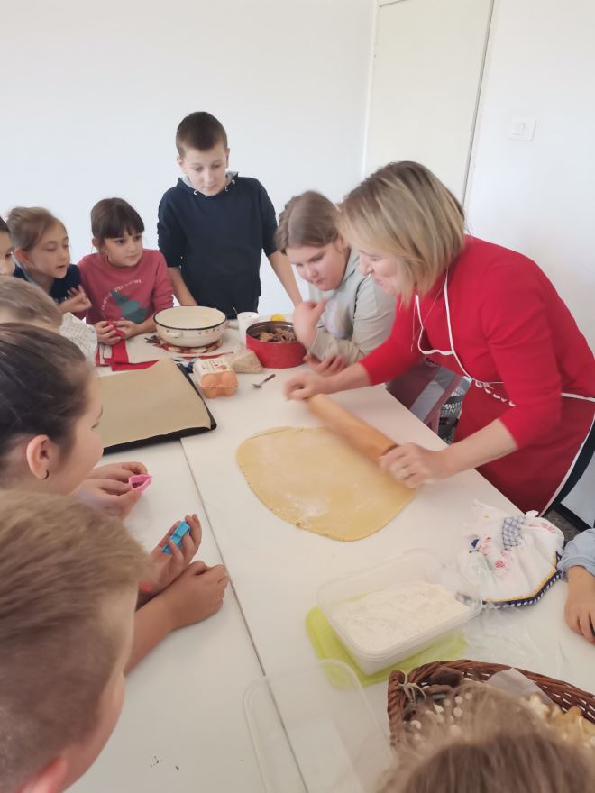Voditeljica izvannastavne aktivnosti Jagoda Šmit pozvala je bake kako bi pokazale izradu i ukrašavanje tradicijskih kolača. Baka Sanja je s učenicima zamijesila prhko tijesto iz kojeg su izrezivali keksiće u obliku božićnih motiva. Nakon što su se ispekli, učenici su keksiće ukrašavali bijelom glazurom. Baka Ljubica je zamijesila tijesto iz kojeg je s učenicima izrađivala kiflice od oraha koje su potom svi zajedno uvaljali u šećer u prahu. Dok su se kolači pekli, marljivi učenici su s bakama ukrasili školski etno kutak. Okitili su bor s kinčem; tradicijskim ukrasima od krep papira, a ispod su postavili jaslice koje su sami izradili od prirodnih materijala. Uredili su i stol u tradicijskom duhu na kojeg su stavili pšenicu, jabuke, posudu sa žitom, vazu sa cvijećem od krep papira i raspelo, a ispod stola su stavili slamu. Za vrijeme uređenja kutka, bake su pričale učenicima kako su nekad tekle pripreme i kako se slavio Božić.