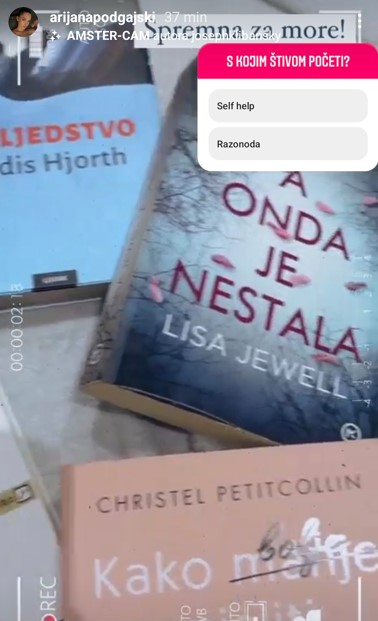 Ona je sa svojim pratiteljima na Instagramu, kojih je iz dana u dan sve više, podijelila nedoumicu: koje knjige ponijeti na more i čitati na plaži. Arijana se odlučila za ozbiljna štiva, poput ona psihoterapeutkinje Christel Petticollin ili britanske autorice popularne fantastike Lise Jewell, a našlo se tu i "Nasljedstvo", slojeviti roman norveške spisateljice Vigdis Hjorth.