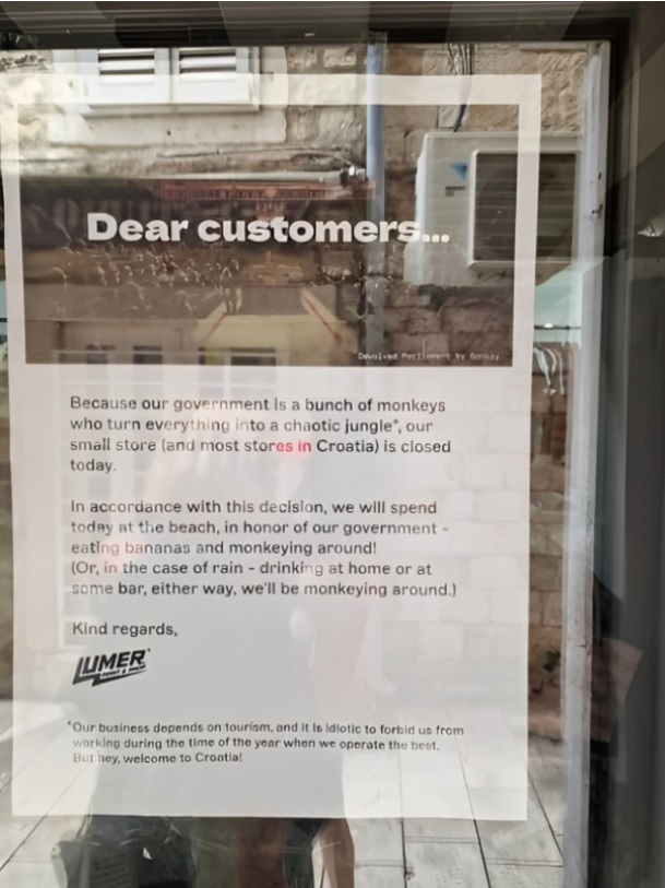Natpisom na vratima jedne trgovine u Splitu vlasnici su se potrudili strancima na engleskom jeziku objasniti zašto su usred turističke sezone zatvoreni, a u pojašnjenju su za to okrivili Vladu, koju su opisali kao 'hrpu majmuna koji sve moraju pretvoriti u kaos i džunglu'.