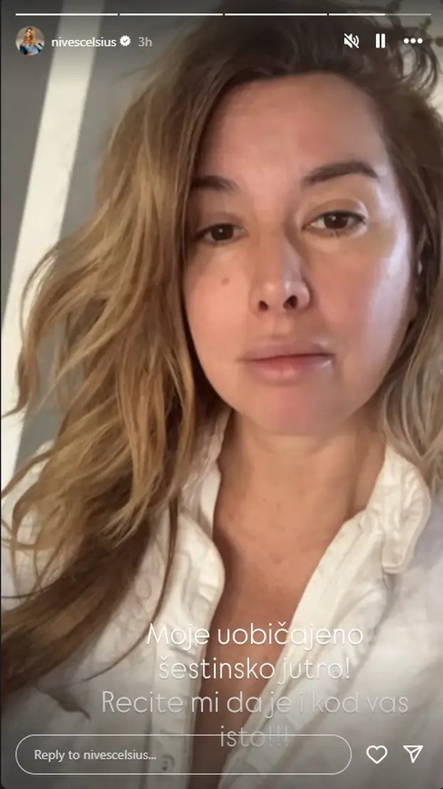 Pjevačica i spisateljica Nives Celzijus jutros je sa svojim pratiteljima na Instagramu podijelila kako izgleda jedno uobičajeno jutro u njenom domu. Pokazala je što je pronašla i kako izgleda bez šminke, prenose 24sata.