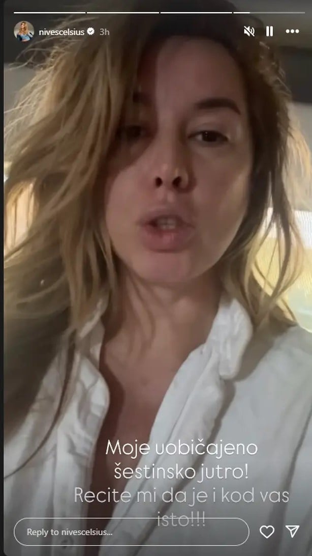 Također, Nives je šaljivo napomenula kako je ovaj video 'ekskluziva' jer ju obožavatelji imaju prilike vidjeti kako izgleda s masnom frizurom, budući da se tek probudila. U video je ubacila i natpis: 'Moje uobičajeno šestinsko jutro! Recite mi da je i kod vas isto!!!'