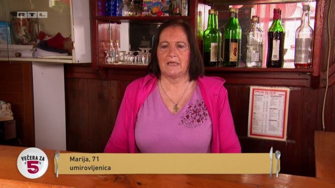 Umirovljenica Marija dolazi iz Ivanca, a u 'Večeru za 5' se prijavila zbog ljubavi prema kuhanju i druženju. Nekad se bavila ugostiteljstvom, a danas vrijeme provodi u pjevanju, održavanju kuće i okućnice, a dosta vremena provodi i kod kćeri na moru. Za sebe će reći da je razumna, komunikativna, iskrena i druželjubiva. Ljubiteljica je tradicionalnih, pomalo zaboravljenih jela.