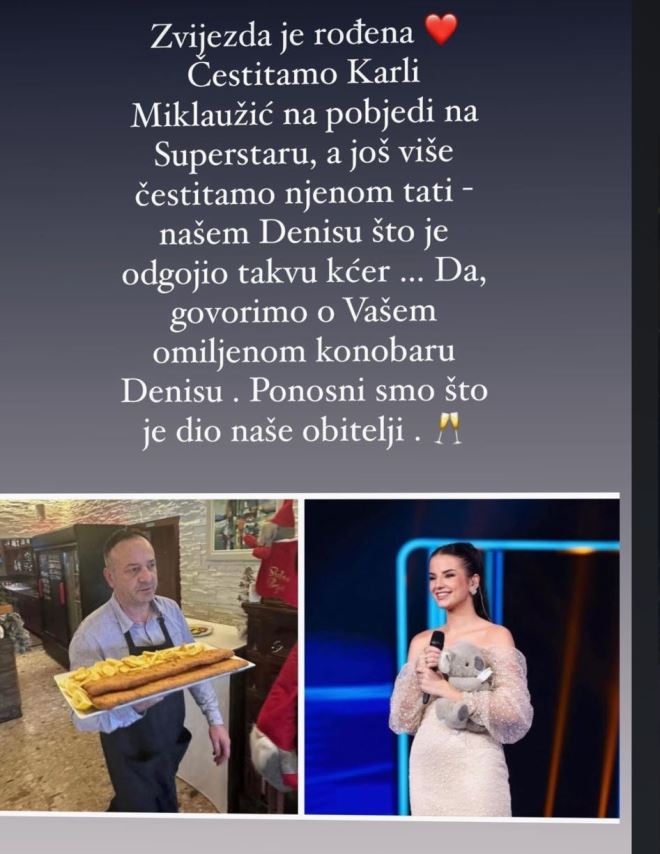''Zvijezda je rođena ❤️ Čestitamo Karli Miklaužić na pobjedi na Superstaru, a još više čestitamo njenom tati - našem Denisu što je odgojio takvu kćer … Da, govorimo o Vašem omiljenom konobaru Denisu . Ponosni smo što je dio naše obitelji.'' - napisali su na društvenim mrežama.