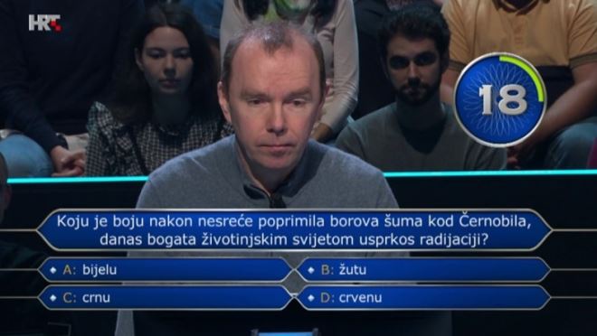 Nije bio siguran koju je boju poprimila borova šuma kod Černobila. U pomoć je pozvao prijatelja s kojim je dijelio mišljenje oko odgovora, no odlučio je iskoristiti i džoker pola-pola. Odgovor na koji su sumnjali on i prijatelj bio je pogrešan, no nije mu pomogao ni drugi džoker, pola-pola.