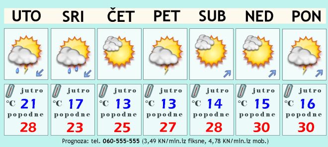 U utorak očekujemo porast naoblake, ali će još uvijek biti sunčanih razdoblja i veći dio dana suho. Navečer i osobito u noći na srijedu su mogući kiša ili grmljavinski pljuskovi. Sa sjevernim vjetrom će već poslijepodne ipak doći i osvježenje. Prije te promjene bit će dosta teško i sparno vrijeme uz nepovoljnu biometeorološku situaciju. Dnevni maksimalac u utorak više vjerojatno neće ići preko 30 stupnjeva, lakše će se disati. Pravo osvježenje ćemo osjetiti tek u noći na srijedu.