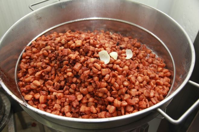 Još pred sedam godina, dok sam radio u jednom trgovačkom centru i tražio dodatni izvor zarade, probao sam napraviti dobre čvarke. Ubrzo se to pokazalo dobrim pa sam dao otkaz i opredijelio se za proizvodnju – ispričao nam je Gerić, koji danas ima devetero zaposlenih te uz pogon u Stubakima ima i dvije maloprodajne trgovine u Zagrebu. U početku se sve radilo ručno, a danas ima strojeve kako bi se olakšao rad, povećala kvaliteta i ubrzao proces proizvodnje. Ipak, ljudski je faktor najvažniji, i upravo je u njemu, osim u špeku, tajna kvalitete. – Radimo isključivo od leđnoga masnog tkiva, koje plaćamo 30 posto više nego što je tržišna cijena. Iako je špek naših svinja kvalitetniji, nema ga dovoljno, ni 20 posto špeka za te potrebe, pa ga uvozimo iz Španjolske. Imamo ugovor s jednom firmom, koja nam garantira selektiranu proizvodnju i uvijek istu kvalitetu, špek 2-3 centimetara debljine – pojasnio je. Osim u kvaliteti špeka i pravilnom skladištenju, tajna je u termičkoj obradi. - Radimo ju na najskuplji, ali i najkvalitetniji način. Sve se ručno miješa, a presudan je čovjek. Svaki špek ne topi se isto, treba znati kada pojačati, a kada smanjiti vatru – dodao je.