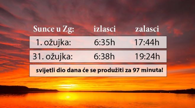Proljeće ozbiljno kuca na vrata, to je svima jasno. A i svijetli dio dana postaje značajno duži, u prosjeku je svaki dan 3 minute duži od prethodnog. Zadnji vikend ovog mjeseca prelazimo i na ljetno računanje vremena, piše portal Kad će kiša na svojoj Facebook stranici. 1. ožujka je sunce izlazilo u 6:35, a zalazilo u 17:44 dok će sunce 31. ožujka izaći u 6:38, a zalazit će u 19:24 sati. To znači da će se svijetli dio dana produžiti za 97 minuta.