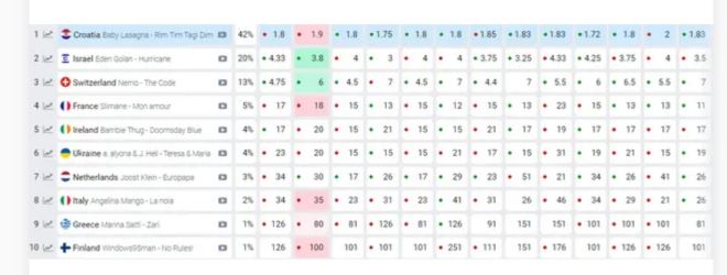 Tijekom ranih poslijepodnevnih sati petka Izraelka je u jednom trenutku 'skočila' na čak 26 posto, Baby Lasagna bio se spustio na 'tek' 37 posto, ali onda su se stvari vratile na staro.