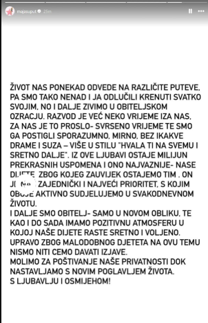 "Život nas ponekad odvede na različite puteve, pa smo tako Nenad i ja odlučili krenuti svatko svojim, no i dalje živimo u obiteljskom ozračju. Razvod je već neko vrijeme iza nas, za nas je to prošlo – svršeno vrijeme te smo ga postigli sporazumno, mirno, bez ikakve drame i suza – više u stilu ‘hvala ti na svemu i sretno dalje‘. Iz ove ljubavi ostaje milijun prekrasnih uspomena i ono najvažnije – naše dijete zbog kojeg zauvijek ostajemo tim. On je naš zajednički i najveći prioritet, s kojim oboje aktivno sudjelujemo u svakodnevnom životu. I dalje smo obitelj – samo u novom obliku, te kao i do sada imamo pozitivnu atmosferu u kojoj naše dijete raste sretno i voljeno. Upravo zbog malodobnog djeteta na ovu temu nismo niti ćemo davati izjave. Molimo za poštivanje naše privatnosti dok nastavljamo s novim poglavljem života. S ljubavlju i osmijehom!", poručila je pjevačica.