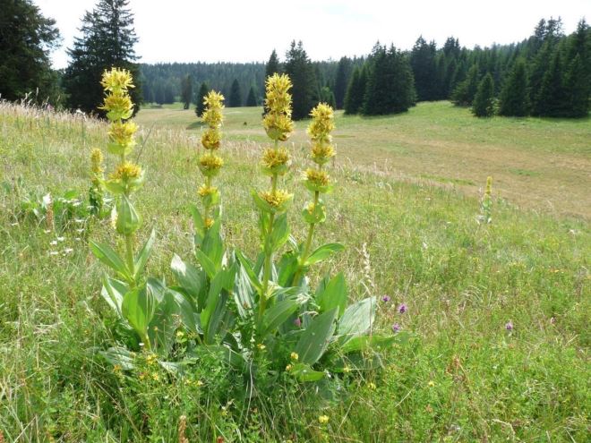 Riječ je o žutom srčaniku, poznatom i po raznim drugim nazivima kao žuta sirištara, žuti encijan, žuta vladisavka, sirištara, srčanik, lincura, gencijana; lat. Gentiana lutea.