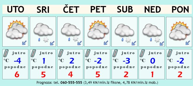 Mraza će biti i u utorak ujutro s temperaturom ispod nule, a moguća je i magla. Tijekom dana sunčana razdoblja iako se magla i niski oblaci mjestimice mogu i dulje zadržati. Vjetar će biti slab. Jutarnja temperatura zraka između -5 i 0°C, a najviša dnevna do 6 ili 7 Celzijevih stupnjeva.