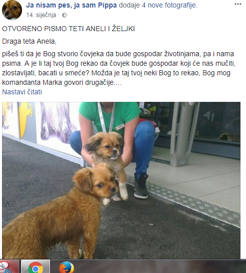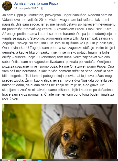 U moru hrvatskih 'Facebook blogera', posebno nam je zapala za oči jedna sasvim neobična 'zagorska blogerica', koja za sebe otvoreno priznaje da je alkoholičarka i čije doživljaje te komentare raznih aktualnosti ponekad pogleda i preko 50 tisuća ljudi. Ne bi to bilo ništa neobično da nije riječ o kujici koja za sebe tvrdi da nije pas, što je vidljivo i iz samog naziva njene Facebook stranice 'Ja nisam pes, ja sam Pippa'.