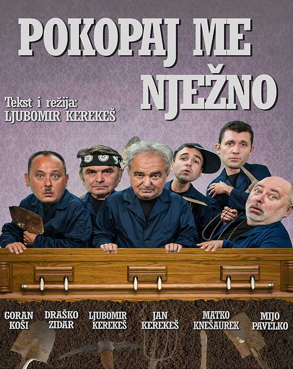 Inače, komedija Kerekesh Teatra koju su Ljubomir i Jan Krekekeš najavili, bavi se deficitarnim zanimanjem – grobarima. U selu Strahlinec, direktor Puh je otvorio vrata pogrebnog poduzeća i mrtvačnice “Pokopaj me nježno”. Uz njegovog, na sve načine ograničenog aisitenta, Mišaka, na javni natječaj za posao grobara javili su se: bosanac rovokop Meho Puzić, albanac slastičar Izmet Haljimi, mekani fizioterapeut Robert Fotić i gluhonijemi Miljenko Pavelić. Pripreme za prvi spovod mogu početi. Pokojnik je…..dobrovoljac.