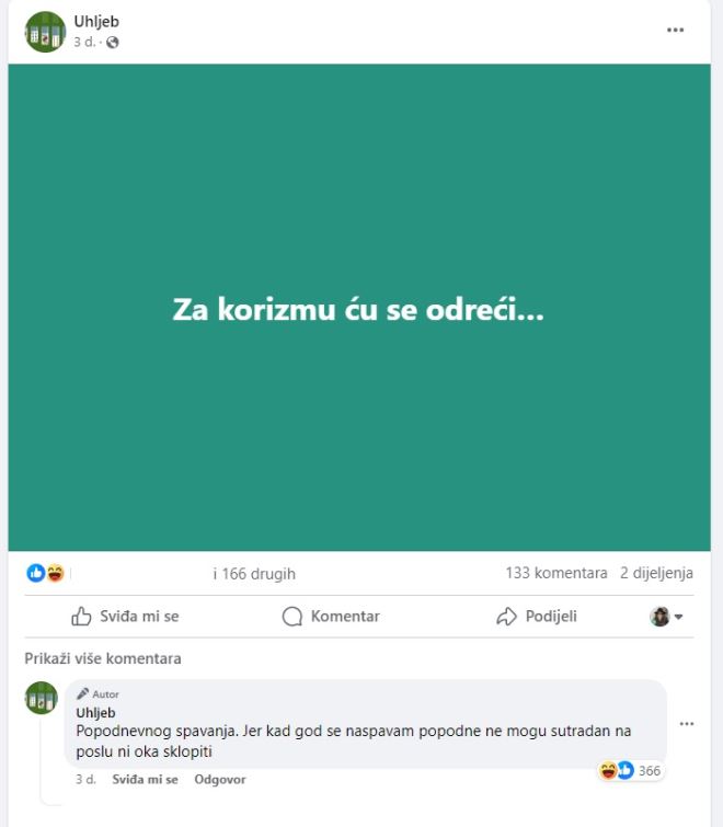 Ispod objave "Za korizmu ću se odreći...", gdje su se u komentarima očekivali odgovori pratitelja stranice, 'Uhljeb' je dao i svoj urnebesni odgovor na to 'pitanje' čega će se on odreći tijekom korizme.