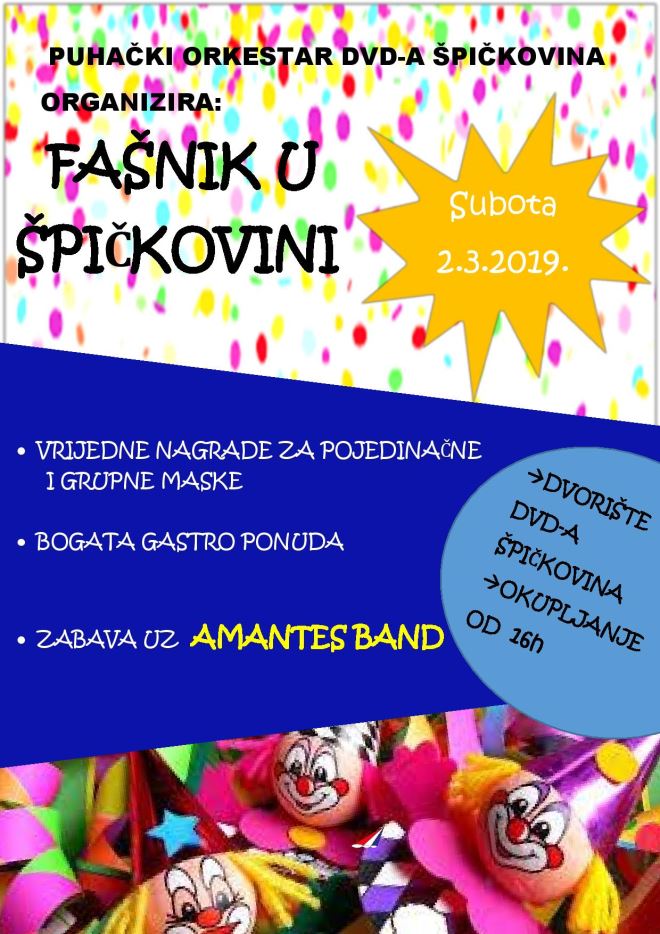 Puhački orkestar DVD-a Špičkovina u subotu 2. ožujka organizira fašnik u dvorištu DVD-a Špičkovina. Okupljanje je od 16 sati, osigurane su vrijedne nagrade za pojedinačne i grupne maske kao i bogata gastro ponuda. Posjetitelje će zabavljati Amantes band.